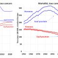 Lorsqu’on fait ces deux corrections, il n’y a pas d’augmentation importante du risque de cancer dans l’ensemble de la population. La figure 2 montre que, chez les hommes, l’incidence des cancers augmente très peu depuis 2013 et que l’essentiel des variations provient de l’évolution du cancer de la prostate ; elle montre aussi que la mortalité par cancer diminue depuis 1987. Chez les femmes, l’incidence des cancers n’augmente dans les années récentes qu’à cause de l’augmentation de la fréquence des cancers du poumon, et la mortalité par cancer diminue depuis 1960.