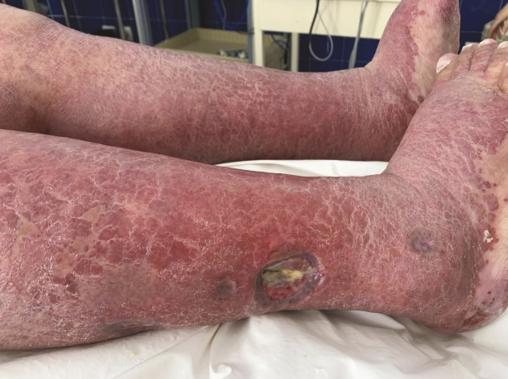 Après quelques jours de traitement immunosuppresseur, une douleur intense et insomniante s’installe, avec érythème et tuméfaction du membre supérieur gauche. Les examens complémentaires retrouvent une protéine C-réactive (CRP) à 300 mg/L, des hémocultures stériles, une échographie Doppler artérioveineuse sans thrombose. Le diagnostic d’une dermohypodermite bactérienne non nécrosante est évoqué dans un premier temps. La patiente est alors traitée par antibiothérapie (amoxicilline et acide clavulanique). L’évolution est défavorable, avec apparition de lésions nécrotico-hémorragiques rapidement extensives (