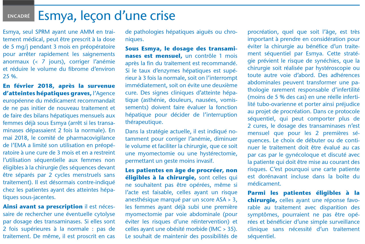 L’acétate d’ulipristal (Esmya) est le premier des SPRM (modulateur sélectif du récepteur de la progestérone) utilisé depuis 2013 dans cette indication. Il entraîne une apoptose cellulaire et donc une régression volumétrique pérenne. Soit au bout d’une semaine un arrêt de tout saignement et chez 80 % des patientes une réduction de volume de 25 %. Il peut être prescrit avec prudence par le gynécologue en préopératoire en se limitant à une cure de 3 mois chez des femmes bien informées des risques (encadré). Son utilisation en « traitement séquentiel » est restreinte aux patientes non éligibles à la chirurgie. Au bout de 2 cures, on observe une réduction de volume de 50 % des fibromes chez la moitié des femmes.9, 10