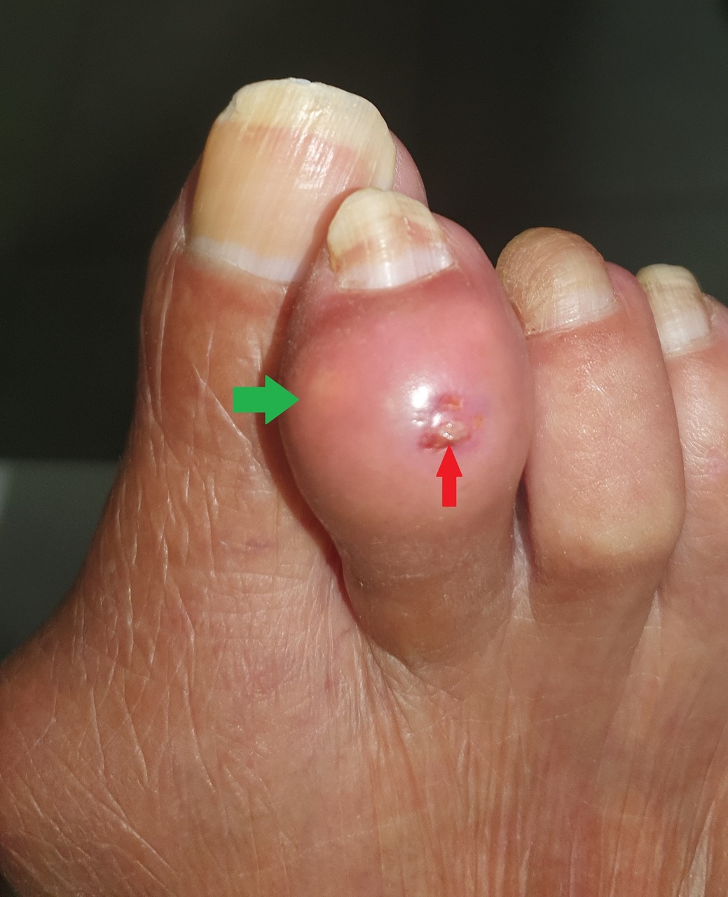 Sylviane a 90 ans. Elle est accompagnée par sa fille, inquiète de l’aspect d’un de ses orteils, siège d’une lésion (figure, flèche rouge) et de formations sous-cutanées de couleur blanc-jaune (figure, flèche verte).