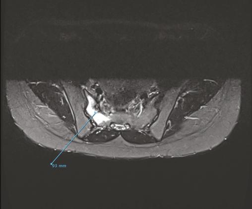 Engagée depuis 2 mois, cette jeune militaire consultait pour des paresthésies des orteils, sans notion de traumatisme aigu. Sédentaire auparavant, elle n’avait aucun antécédent particulier. Son indice de masse corporelle était de 20 kg/m2. L’examen notait une douleur neurogène avec trouble des sensibilités prédominant à l’extrémité du pied droit, sans syndrome radiculaire ni rachidien, d’horaire non mécanique. Le test de Faber était positif. Réalisée en seconde intention, l’IRM du bassin (v. figures) montrait une fracture de contrainte de l’aileron sacré droit. Le bilan biologique était sans particularité. Une cure courte d’anti-inflammatoires non stéroïdiens et la limitation au minimum des activités physiques entraînaient la guérison en 8 semaines.