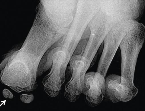 La radiographie avec incidence axiale des sésamoïdes met en évidence un aspect fragmenté et hétérogène du sésamoïde médial (