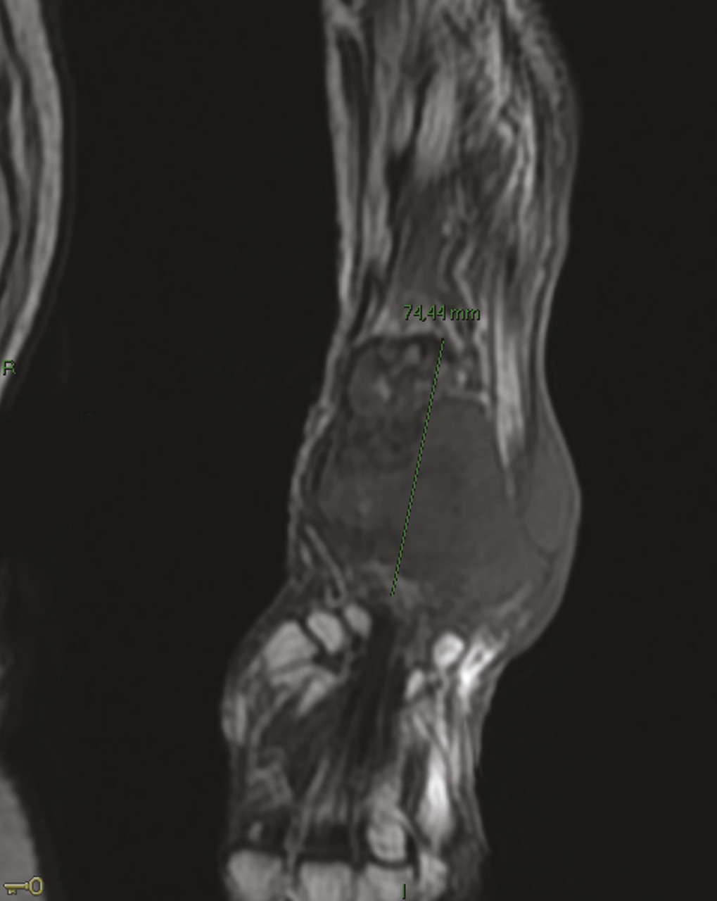 Elle est admise à l’hôpital deux ans plus tard pour des douleurs mixtes et une tuméfaction douloureuse du tiers distal de l’avant-bras gauche, dure et fixe (fig. 1 ). À l’examen physique, la patiente est grabataire et souffre de douleurs osseuses provoquées diffuses, avec une sarcopénie. La radiographie standard met en évidence une importante ostéolyse radiale inférieure, avec rupture des corticales, associée à des images d’ossifications en regard s’étendant aux parties molles épaissies (fig. 2 ). Le même aspect est confirmé sur l’IRM (fig. 3 ). La tomodensitométrie (TDM) thoraco-abdomino-pelvienne est normale. La mammographie ne retrouve pas d’anomalie. La biopsie chirurgicale montre une lésion inhabituelle associant une substance amorphe, une ostéogenèse et des cellules atypiques. Un diagnostic formel n’a pas pu être posé et il n’y avait pas d’arguments pour une origine maligne ou une tumeur osseuse primitive sur le prélèvement. Par ailleurs, le bilan de fractures multiples n’a pas mis en évidence de syndrome inflammatoire biologique. En revanche, une hypophosphorémie a motivé la réalisation d’une scintigraphie osseuse montrant un aspect évocateur d’ostéomalacie.