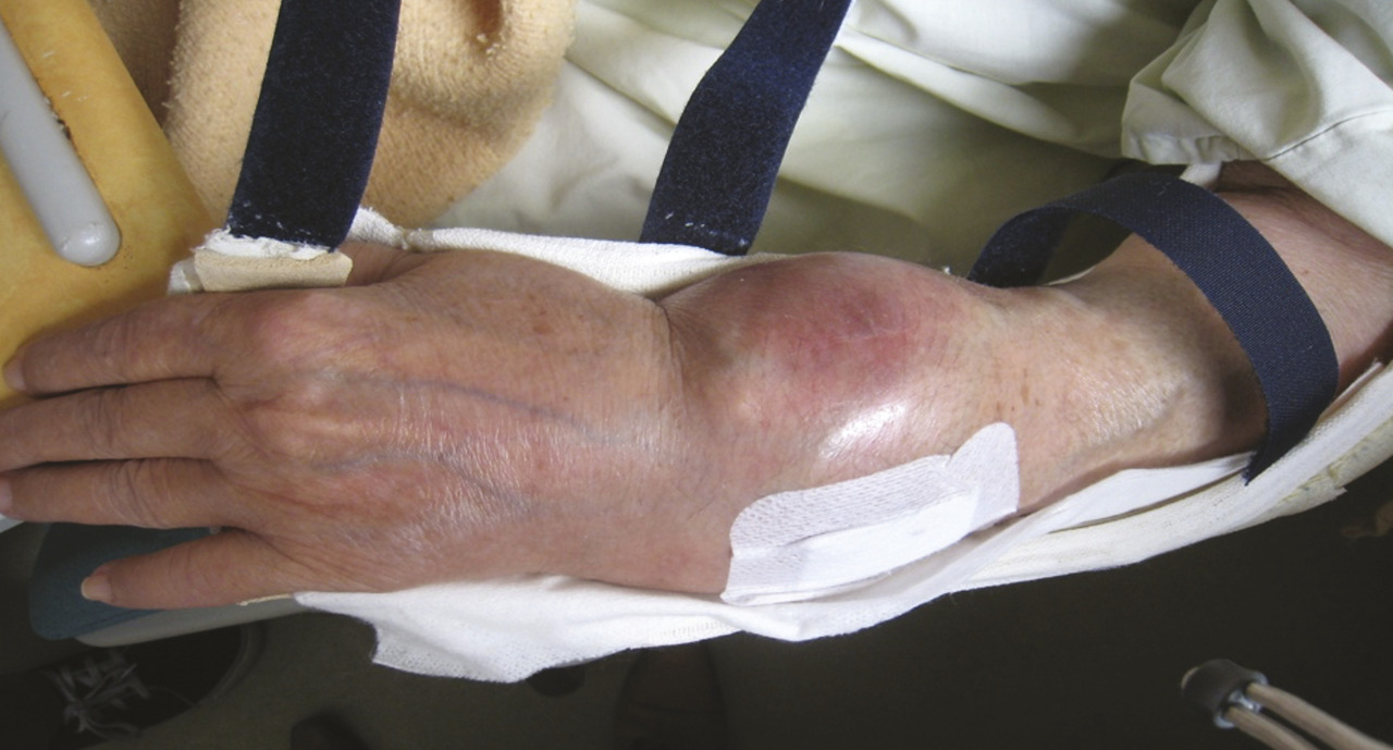 Elle est admise à l’hôpital deux ans plus tard pour des douleurs mixtes et une tuméfaction douloureuse du tiers distal de l’avant-bras gauche, dure et fixe (