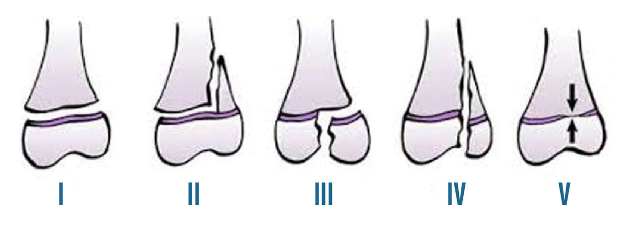 - type V, une lésion directe du cartilage de croissance par un mécanisme de compression n’est identifiable que par sa complication : le pont d’épiphysiodèse. Ce diagnostic est le plus souvent posé a posteriori.