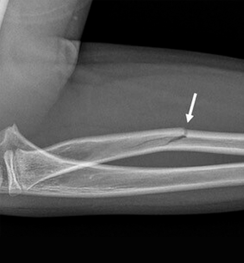 - fracture « plastique » ou « arcuature » : il n’y a pas de fracture mais une courbure plastique s’étendant sur toute la longueur de l’os (fig. 5) ;