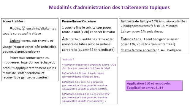 La perméthrine s’applique en une couche unique le soir, pour être rincée le lendemain matin alors que le benzoate de benzyle nécessite deux badigeons successifs à 10 - 15 minutes d’intervalle, le second à laisser en place 24 h ; chez les moins de 2 ans, on emploie un seul badigeon, à laisser poser 12 h (voire 6 h chez les moins de 1 an ; irritant +++). Chez l’enfant, il faut appliquer le topique sur tout le corps, y compris le visage et le cuir chevelu (ne pas oublier paumes des mains, plantes des pieds et ongles). Les modalités détaillées d’administration des topiques sont indiquées dans la figure 3.