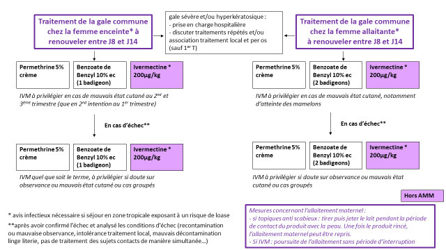 En 1re intention, la perméthrine, le benzoate de benzyle ou l’ivermectine peuvent être prescrits au cours des 2e et 3e trimestres et durant l’allaitement. L’ivermectine n’est proposée qu’en seconde intention au premier trimestre.