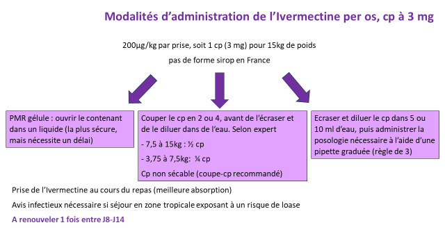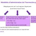 L’ivermectine n’étant pas disponible en sirop en France, il faut couper et écraser les comprimés ou faire préparer des gélules par les pharmaciens voir dissoudre les comprimés et administrer la quantité souhaitée. Pour en améliorer l’absorption, la prise doit être effectuée au cours d’un repas. Les modalités pratiques pour la préparation sont décrites en figure 2.