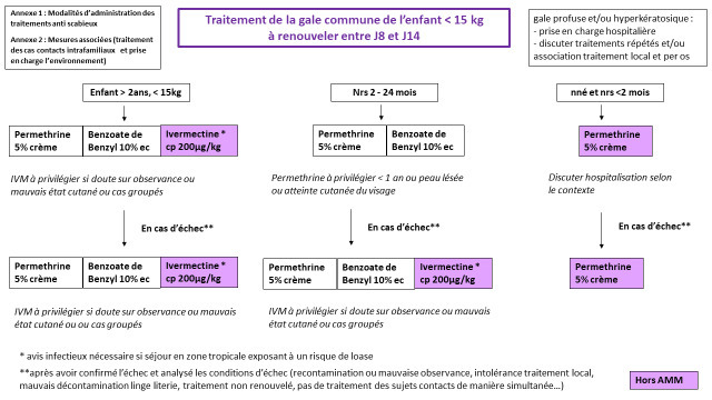Chez l’enfant de plus de 2 ans, même dont le poids est inférieur à 15 kg, le traitement de première intention peut être local (perméthrine 5 % ou benzoate de benzyle 10 % émulsion) ou oral (ivermectine 200 µg/kg). L’ivermectine doit être privilégié en cas de doute sur l’observance, de peau lésée ou de cas groupés.