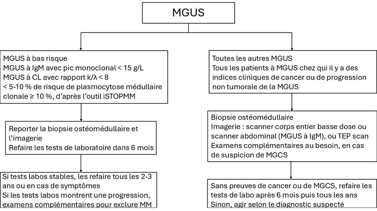 - MGUS à bas risque et assimilées (cf. figure) : abstention thérapeutique ; reporter la biopsie ostéomédullaire et l’imagerie, et après 6 mois réaliser les tests biologiques suivants : électrophorèse des protéines sériques, immunofixation, dosage sérique des chaînes légères libres kappa et lambda, hémogramme, calcémie, créatininémie. En cas de résultats stables, refaire ces tests tous les 2 - 3 ans ; s’ils ne sont pas stables, il faut les refaire plus souvent et éventuellement faire des examens complémentaires à la recherche d’une progression (notamment myélome multiple) ;