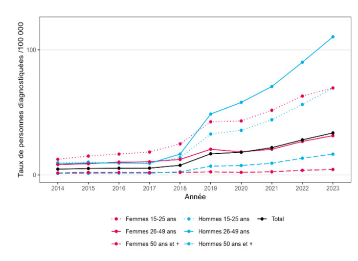 Le taux d’incidence de la gonorrhée augmente en France depuis quelques années, dans les deux sexes et toutes les classes d’âge (v. figure ci-contre). Pourtant, son traitement a peu évolué depuis trois décennies, aucun nouvel antibiotique n’ayant fait ses preuves dans cette indication depuis l’arrivée des céphalosporines de troisième génération (ceftriaxone et céfixime) dans les années 1990. Or ces dernières font face à une antibiorésistance – tout comme les antibiotiques précédemment utilisés – qui augmente depuis les années 2000. Plus d’un quart des patients sont résistants à la ceftriaxone dans certaines régions asiatiques !