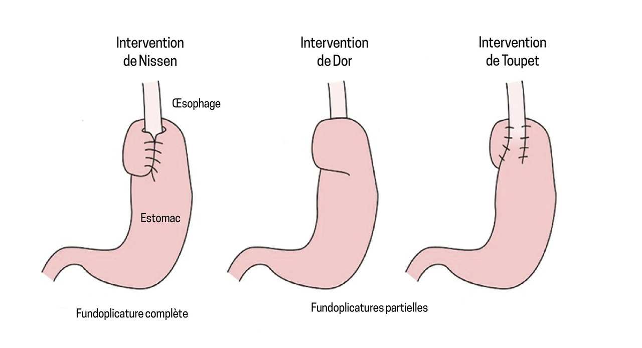 Plusieurs techniques chirurgicales ont été décrites pour renforcer le sphincter œsophagien inférieur (fig. 3) :