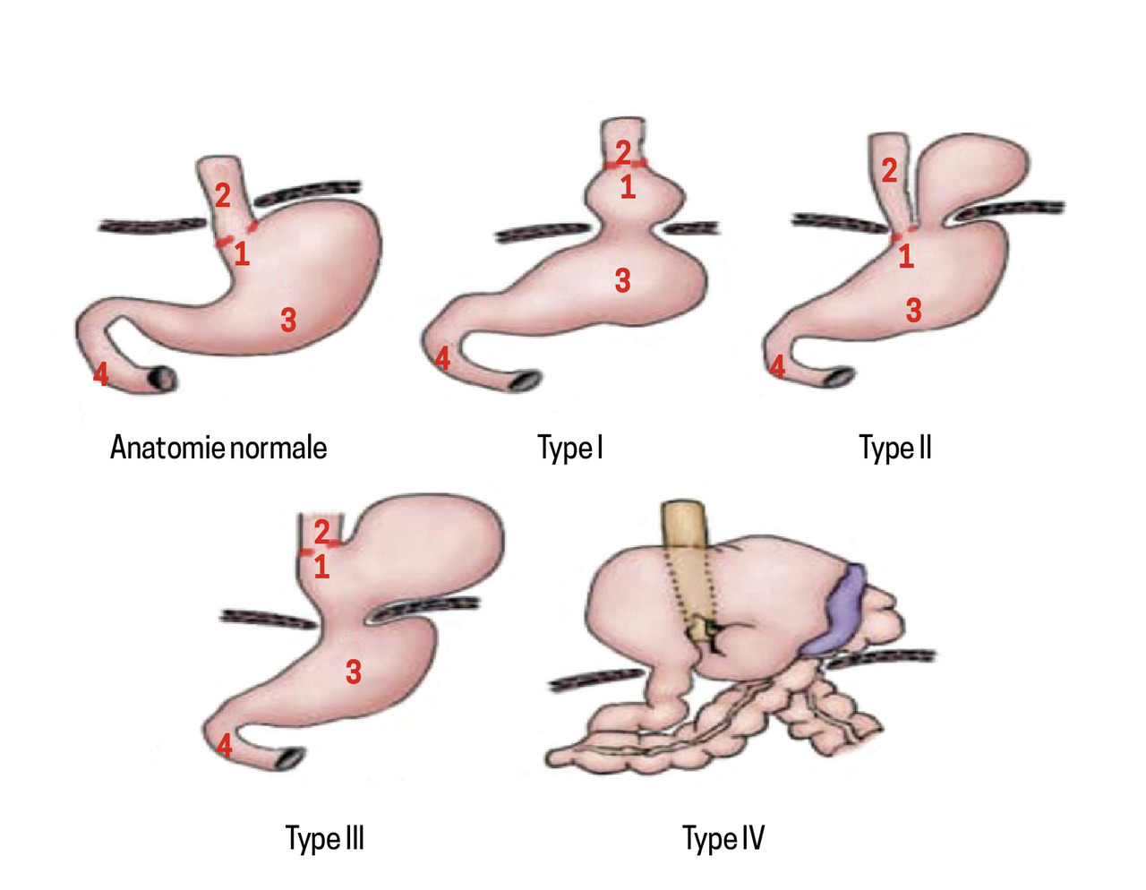 • le type IV (hernie mixte) correspond à l’ascension de la JOG, de l’estomac et d’un autre organe intra-abdominal dans le médiastin (côlon, intestin, grêle, rate, etc.).