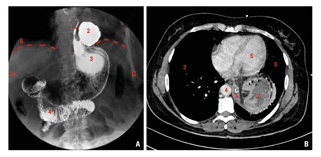 Les examens complémentaires réalisés en cas de suspicion de hernie hiatale associent une gastroscopie, permettant d’exclure des lésions œsophagiennes ou gastriques intraluminales, et un bilan d’imagerie morphologique comprenant un transit œso-gastro-duodénal (fig. 2A) ou un scanner thoraco-abdominal (fig. 2B).7