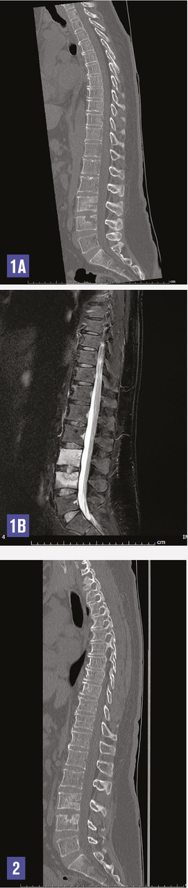 Cette femme de 46 ans avait des rachialgies mixtes évoluant depuis 3 mois sans fièvre, avec pour antécédents une chirurgie bariatrique et une ostéoporose densitométrique. L’examen clinique et le bilan biologique (dont des prélèvements bactériologiques) étaient sans particularité. Le scanner rachidien (fig. 1A) montrait une ostéolyse du plateau supérieur de L4 et une hypodensité du plateau inférieur de L3, et une prise de contraste et un hypersignal T2 des corps vertébraux et du disque à l’IRM (fig. 1B) compatible avec une spondylodiscite L3-L4. Les douleurs régressant à l’alitement et aucun germe n’étant trouvé à la biopsie discovertébrale, le diagnostic de spondylodiscite n’était pas retenu et la patiente était verticalisée avec le port d’un corset, sans complication. Deux mois plus tard, l’IRM montrait une nette régression de la prise de contraste L3-L4 avec néanmoins la persistance d’un hypersignal T2 au sein de la portion centrale du disque. Le scanner (fig. 2) montrant des phénomènes de reconstruction osseuse, le diagnostic retenu était celui de fractures des plateaux inférieur de L3 et supérieur de L4 dans le cadre d’une hernie intraspongieuse dans un contexte d’ostéoporose rachidienne.