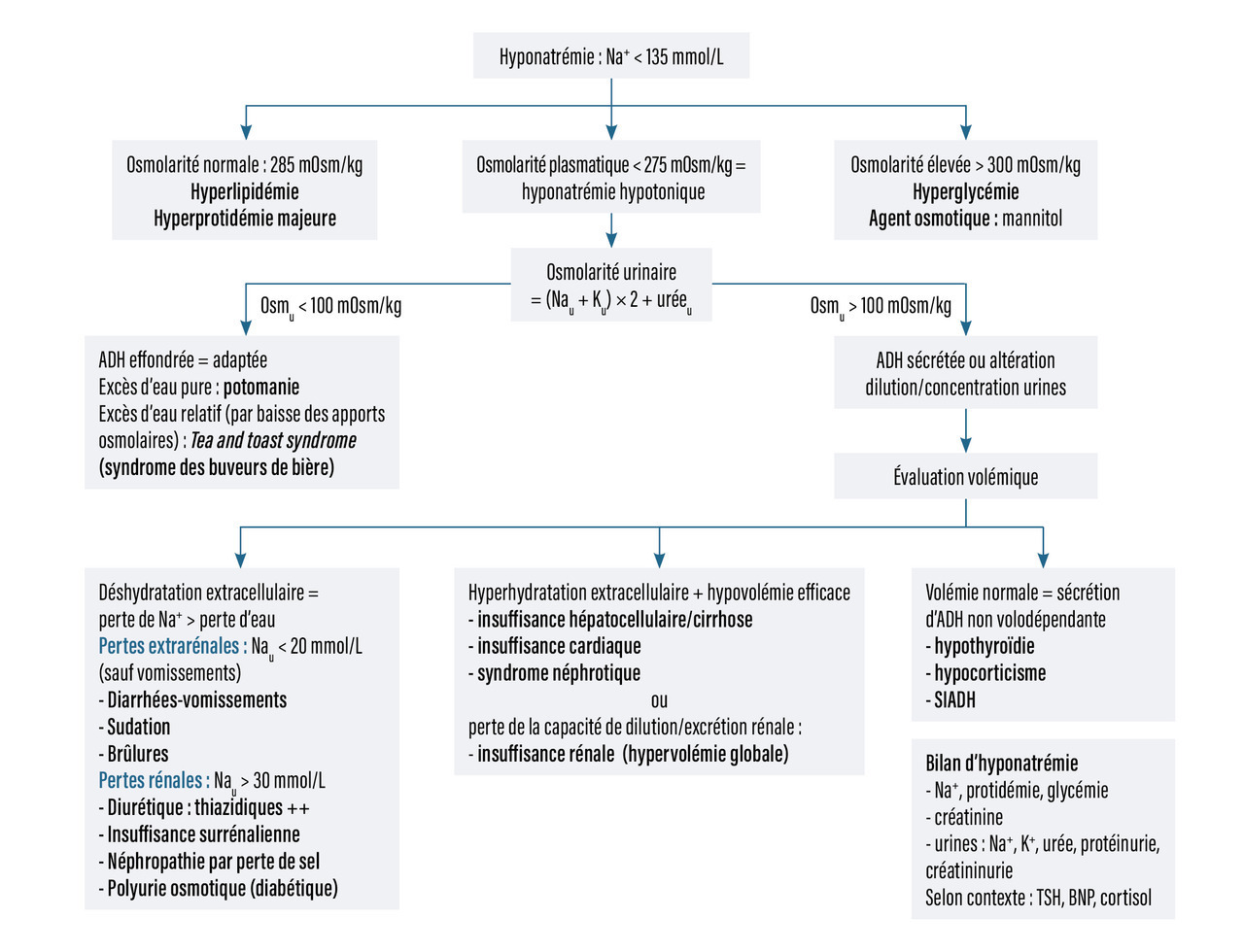 La première étape consiste à s’assurer qu’il s’agit bien d’une hyponatrémie vraie (hypo-osmolaire), et donc à éliminer les causes d’hyponatrémie hyper- ou iso-osmolaire (voir plus haut).