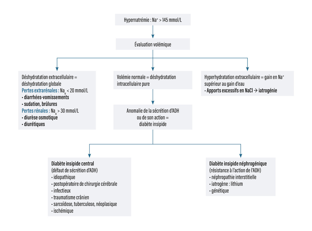 L’hypernatrémie/hyperosmolalité plasmatique indique systématiquement une déshydratation intracellulaire. Ce trouble ne survient que lorsque l’accès à l’eau est limité. Il n’existe pas de fausse hypernatrémie, mais, dans certains cas, la natrémie peut sous-estimer l’hyperosmolalité ; c’est par exemple le cas dans le cadre du coma hyperosmolaire dans le diabète, où la glycémie élevée a un pouvoir osmotique important.