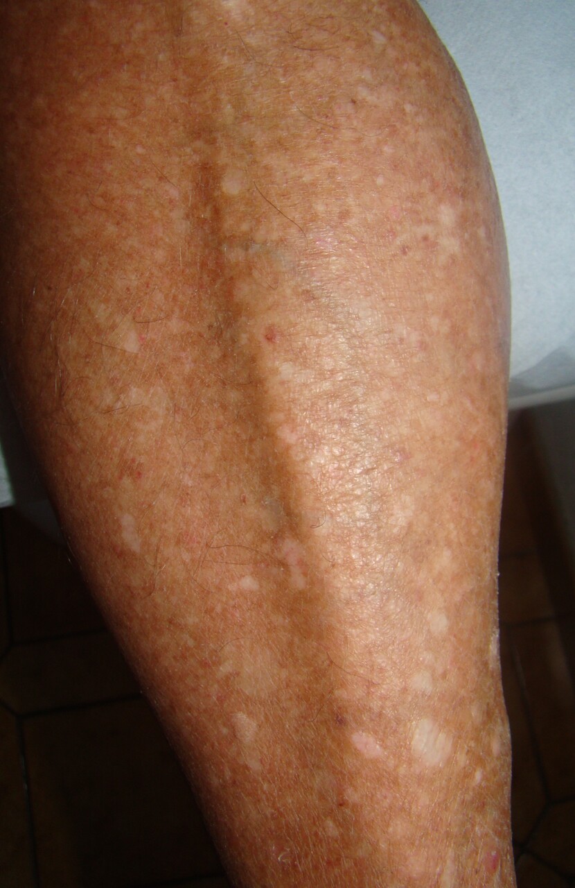 Elle se caractérise par des macules de couleur blanche en nombre plus ou moins important (les lésions uniques sont rares), arrondies, de taille < à 6 mm. Les contours sont assez réguliers, et ces lésions sont situées sur les zones photoexposées (bras, avant-bras, cuisses et jambes). Le nombre de macules peut augmenter avec l’avancée en âge, mais leur taille ne se modifie pas avec le temps. Ces formations peuvent être associées à des macules hyperpigmentées (lentigos actiniques).