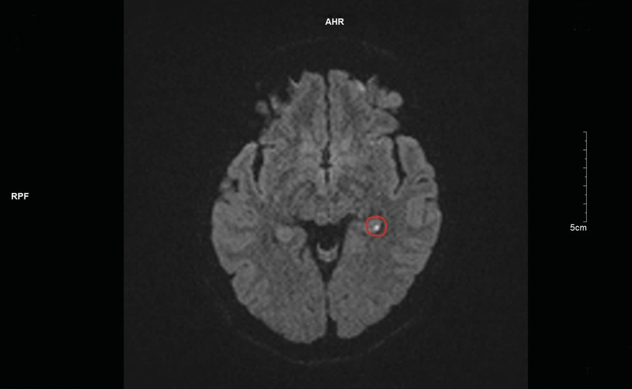 Une imagerie par résonance magnétique (IRM) cérébrale est réalisée quarante-huit heures après l’épisode, mettant en évidence un hypersignal punctiforme en séquence diffusion (fig. 1) et en hyposignal ADC (apparent coefficient diffusion) [fig. 2] localisé à la partie interne du lobe temporal gauche.