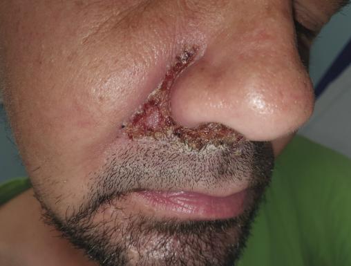 Jean-Marc, 43 ans, est très inquiet : il a été piqué par un moustique une semaine plus tôt ; secondairement, une lésion croûteuse disgracieuse au pourtour du nez est apparue (photo). Après un interrogatoire poussé, le patient convient s’être gratté compulsivement, avec des doigts pas nécessairement propres.