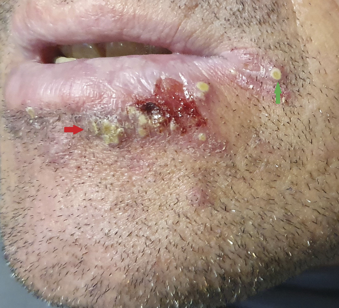 Sur le plan clinique, les récurrences labiales surviennent généralement au niveau de la jonction cutanéo-muqueuse des lèvres. Avant toute apparition de lésion, le patient décrit une sensation de brûlure ou de picotements soutenue au niveau des lèvres. Des placards érythémateux surmontés de vésicules apparaissent ensuite, regroupés en bouquets. La douleur peut inciter le patient à manipuler les lésions avec des mains parfois souillées, causant une impétiginisation. Apparaissent alors des formations croûteuses mélicériques (figure, flèche rouge ) et pustuleuses suintantes (figure, flèche verte ), éléments cutanés secondaires à la présence de Staphylococcus aureus.
