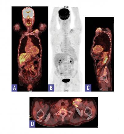 Cet homme de 71 ans, qui avait bénéficié d’un remplacement valvulaire aortique il y a 2 ans et de la pose d’un défibrillateur automatique implantable il y a 8 mois, consultait pour une fièvre prolongée. L’auscultation cardiaque notait un souffle au foyer aortique. La protéine C-réactive et la procalcitonine étaient élevées, les hémocultures étaient positives à Streptococcus aureus ; l’échographie transœsophagienne ne montrait pas de végétation sur la valve prothétique. Une tomographie par émission de positons couplée à la tomo- densitométrie au 18fluorodésoxyglucose (TEP-TDM au 18F-FDG) était réalisée, elle était négative au niveau cardiaque ; en revanche elle montrait un hypermétabolisme pathologique au pourtour du boîtier du défibrillateur implanté au niveau prépectoral gauche. Ce dernier était retiré et l’examen bactériologique confirmait la présence de Streptococcus aureus.