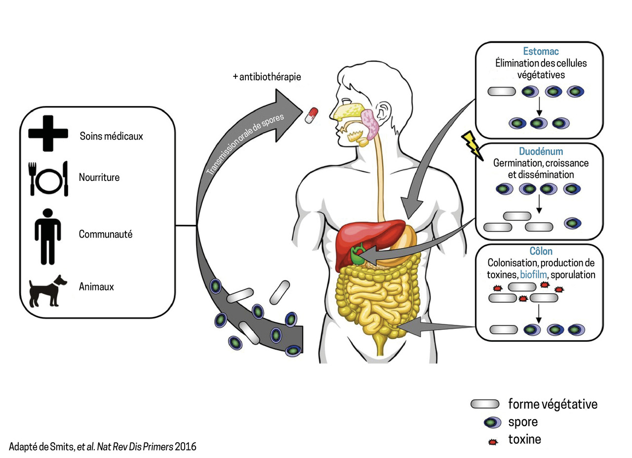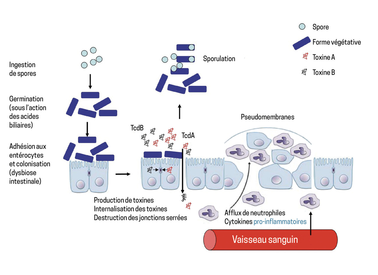 L’infection à C. difficile se développe chez des patients ayant une dysbiose (déséquilibre) intestinale, le plus souvent consécutive à la prise d’antibiotiques.
