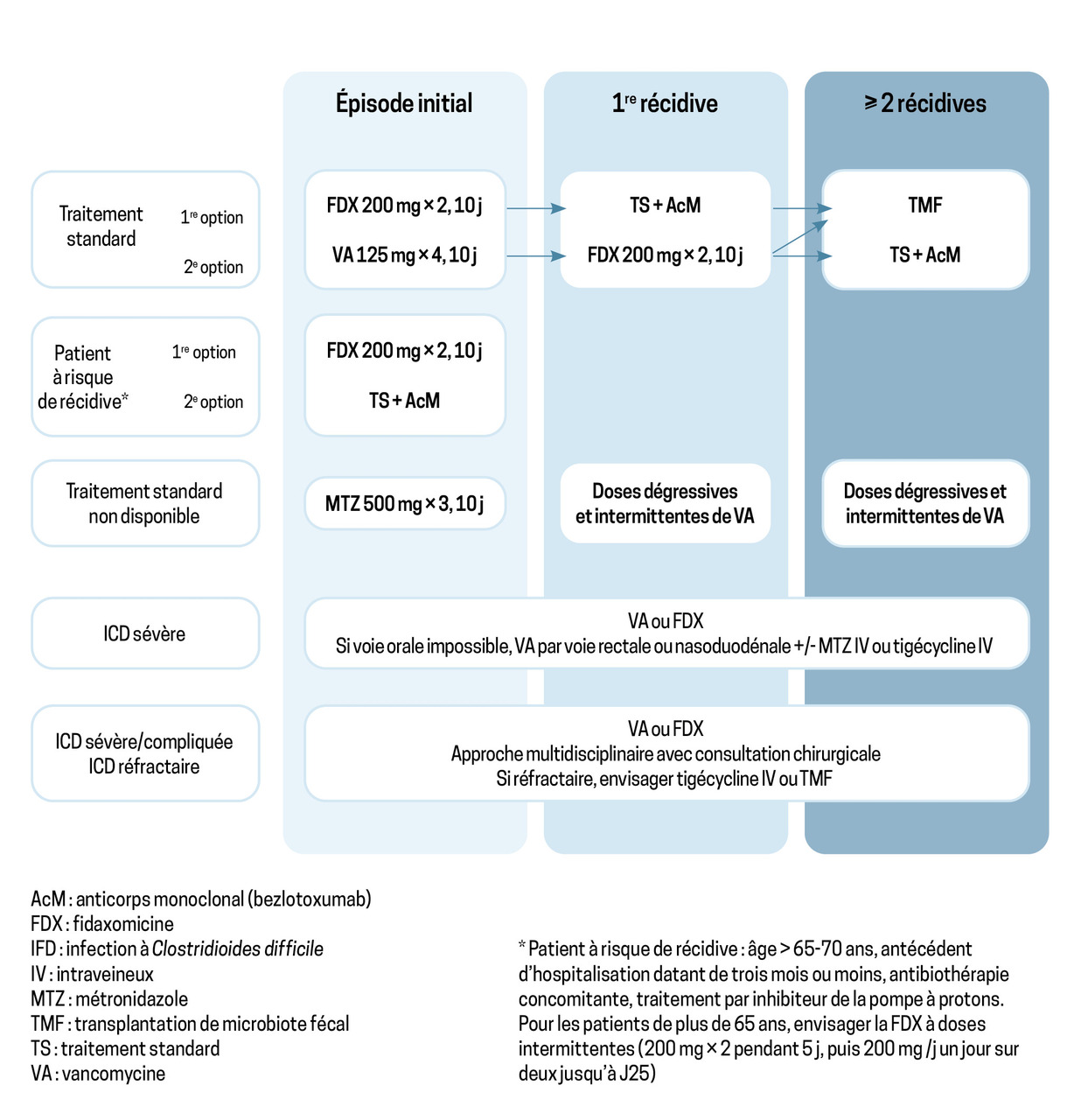 Les recommandations pour le traitement des ICD ont récemment été réactualisées par la Société européenne de microbiologie clinique et de maladies infectieuses (ESCMID).20 Elles sont stratifiées en fonction de la forme clinique (bénigne, sévère, compliquée), du risque de récidive et du nombre de récidives (fig. 4). Une ICD est considérée comme sévère si le patient a une fièvre de plus de 38,5 °C, ou une créatinémie 1,5 fois supérieure à la valeur de base, ou une hyperleucocytose supérieure à 15 000/mm3. Un patient est considéré à risque de récidives s’il possède un des critères suivants : âge supérieur à 65 ans, antécédents d’hospitalisation datant de trois mois ou moins, antibiothérapie concomitante, traitement par inhibiteurs de la pompe à protons.