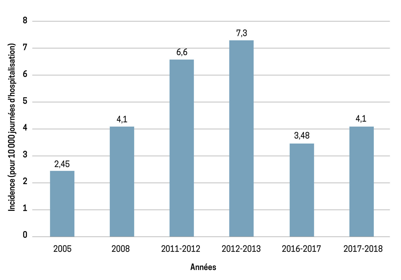 La France a connu la même évolution. Selon les données du PMSI, l’incidence des ICD a augmenté de 2010 à 2015, puis s’est stabilisée à partir de 2015 avec environ 20 000 séjours hospitaliers mentionnant une ICD en diagnostic principal ou associé, soit une incidence de 3,6 cas pour 10 000 journées d’hospitalisation.10 Les résultats du réseau BMR-RAISIN regroupant 207 établissements hospitaliers confirment ces données, avec une estimation de l’incidence des ICD à 3,1/10 000 journées d’hospitalisation en 2017.