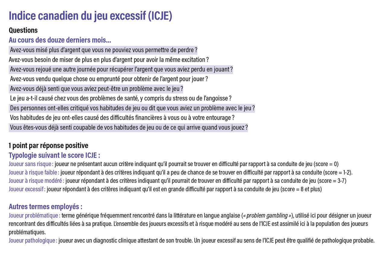 Entre 1960 et 2017, en France, le chiffre d’affaires de l’industrie des jeux d’argent est passé de 98 millions d’euros à 48,1 milliards d’euros.1 En 2023, près d’un adulte sur deux avait joué au moins à un jeu d’argent et/ou de hasard (JAH) au cours de l’année. Depuis 2010, cette part est restée stable, alors que la pratique problématique – au sens de l’indice canadien du jeu excessif (ICJE) [fig. 1] – des JAH parmi les adultes est passée de 1,3 % en 2010 (soit 600 000 joueurs problématiques) à 2,5 % en 2023 (soit près de 1 200 000 joueurs problématiques dont près de 400 000 joueurs « excessifs »).2,3
