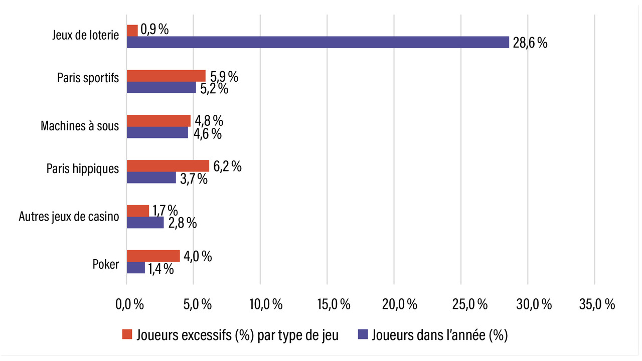 Selon des travaux réalisés sur la population néo-zélandaise, le fardeau des dommages associés aux jeux d’argent serait proche en ampleur de celui lié à l’alcool et trois fois plus élevé que celui lié aux drogues.4Comparativement aux autres joueurs, les joueurs problématiques sont davantage des hommes, plus jeunes (moins de 35 ans), appartenant à des milieux sociaux modestes, avec un niveau d’éducation et des revenus inférieurs à ceux de la population générale. Sur le plan professionnel, ils sont plus fréquemment chômeurs.