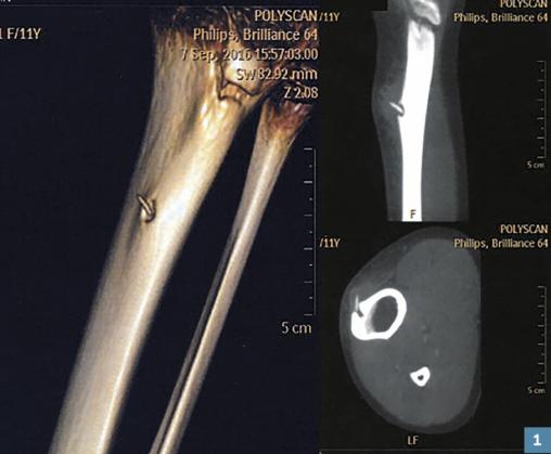 Traitement : ablation chirurgicale du ou des fragments de radioles et exérèse du foyer d’ostéite. Chez cette jeune fille : excision large du tissu osseux infecté et adjacent, avec curetage endomédullaire. L’analyse bactériologique ayant identifié un staphylocoque doré sensible à l’acide fusidique (50 mg/kg/j) et à la rifampicine (20 mg/kg/j), une antibiothérapie a été poursuivie pendant 3 mois. Contrôle scanographique annuel durant 5 ans.
