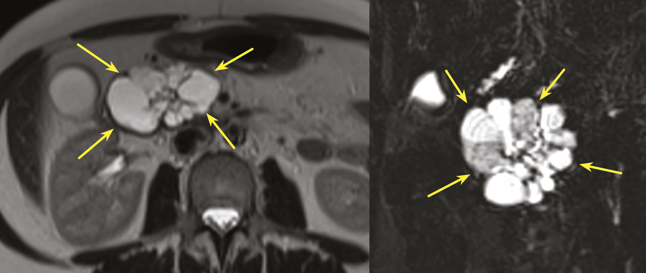 16. Delavaud C, d’Assignies G, Cros J, et al. CT and MR imaging of multilocular acinar cell cystadenoma: Comparison with branch duct intraductal papillary mucinous neoplasia (IPMNs). Eur Radiol 2014;24(9):2128‑36.