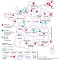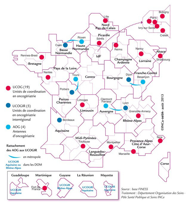 Le troisième Plan cancer avait choisi pour l’une de ses priorités la réduction des inégalités d’accès aux soins, en particulier les inégalités territoriales.5 En 2011, un appel d’offres a été lancé pour développer à l’échelon du territoire des unités de coordination en oncogériatrie (UCOG), prolongeant et étendant le périmètre des UPCOG, et pour mettre en place – outre les structures de prise en charge – des réunions de concertation pluriprofessionnelle (RCP) dédiées. En pratique, 24 UCOG et 4 antennes ont été déployées sur tout le territoire. Quatre structures sont des UCOGIR (UCOG inter-régionales pour l’outre-mer : les associations sont Aquitaine pour La Réunion, la Guadeloupe et Mayotte, et Auvergne-Rhône-Alpes pour la Guyane) [figure]. Le financement annuel représente en tout 5,2 millions d’euros répartis en 160 000 à 250 000 euros par UCOG, 50 000 euros pour le support interrégional et 90 000 euros par antenne oncogériatrique.