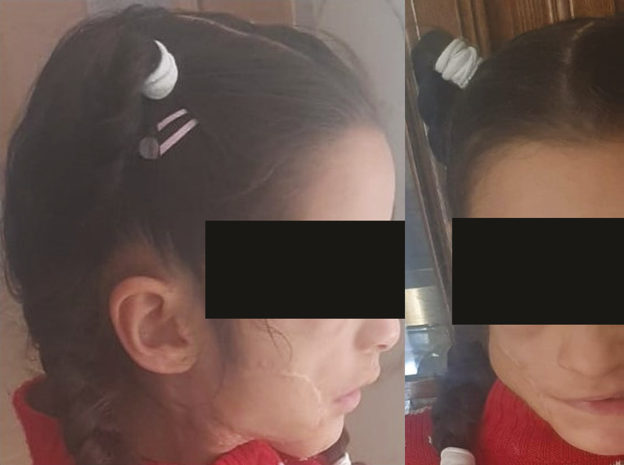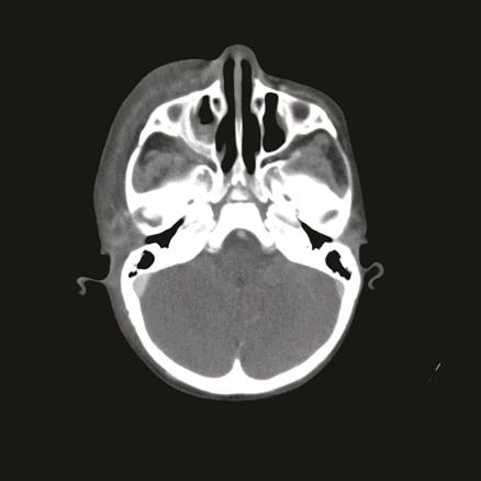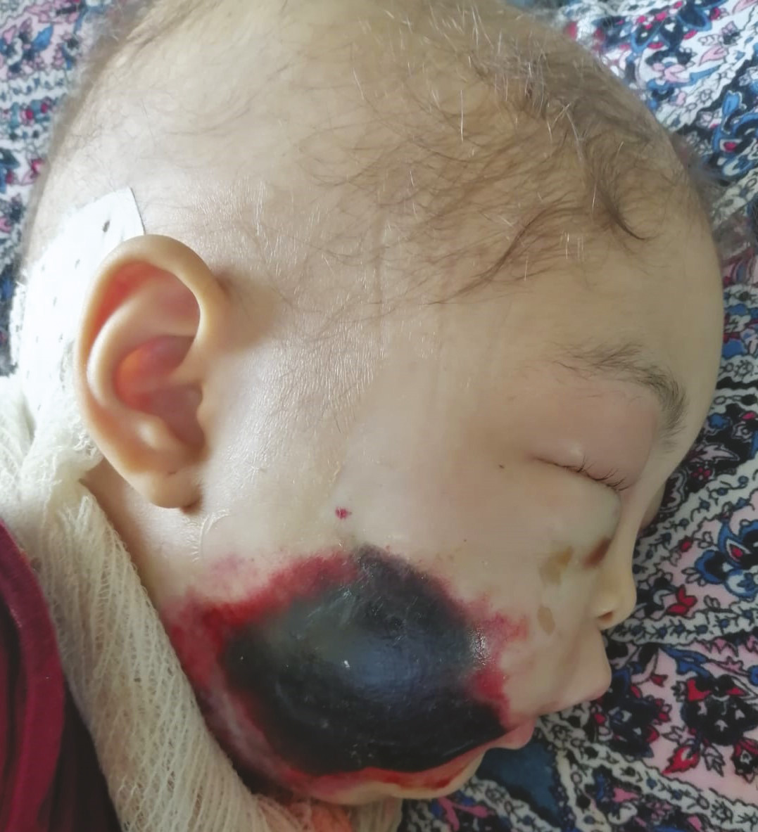Une patiente âgée de 3 ans est suivie pour un lymphome de Burkitt à double localisation maxillaire et abdominale avec envahissement médullaire, mis sous protocole de chimiothérapie GFAOP/LMB 2005. Trois mois après le diagnostic et quinze jours après une cure de chimiothérapie, elle présente une écorchure post-traumatique au niveau de la joue droite, négligée par la famille. Devant l’apparition de fièvre et l’extension de la lésion (fig. 1 ), la famille consulte. L’examen, à l’admission, trouve une patiente fébrile, en choc septique, avec un tableau de fasciite nécrosante : tuméfaction jugale droite de 7 cm, très douloureuse à la palpation, chaude, dure et centrée par un placard de nécrose de 5 cm de diamètre, associée à un œdème palpébral homolatéral. La tomodensitométrie (TDM) objective une cellulite préseptale droite avec infiltration phlegmoneuse des parties molles (fig. 2 ). Une antibiothérapie à large spectre est administrée. Après correction du bilan d’hémostase, une nécrosectomie avec résection profonde des muscles de l’hémiface droite est réalisée, suivie dans un deuxième temps d’une greffe cutanée. L’évolution clinique est favorable. Après quatre ans de suivi, les résultats actuels montrent une amélioration significative (fig. 3 ).