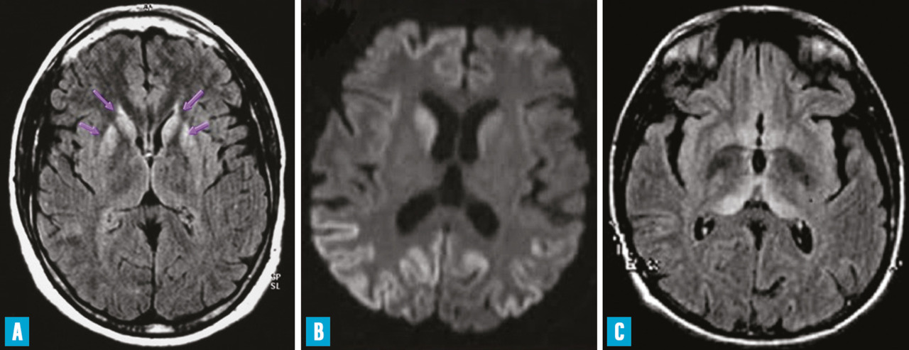 L’observation sur l’imagerie par résonance magnétique (IRM) d’hypersignaux dans les noyaux gris centraux ou dans le cortex cérébral, sur les séquences T2, FLAIR ou de diffusion avec une diminution du coefficient de diffusion apparent de l’eau (ADC) est fréquente (fig. 1 A et B). Il n’existe pas de prise de contraste.