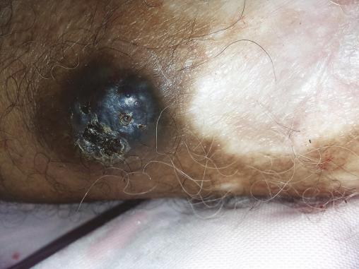 Cet homme de 58 ans consultait pour de multiples lésions nodulaires noirâtres, apparues depuis quelques mois sur une lésion nodulaire post-traumatique évoluant depuis 1 an sur la face interne de la jambe gauche ; ces lésions dont quelques-unes avaient une surface ulcérée étaient étagées le long du membre (fig. 1 ). Ces lésions étaient entourées d’un placard achromique bien limité, rappelant l’aspect d’un vitiligo (fig. 2 ) ; le patient ne rapportait pas d’antécédent personnel ou familial de vitiligo. Une biopsie de la lésion initiale confirmait le diagnostic de mélanome avec un indice de Breslow à 9 mm (fig. 3 ). Le bilan d’extension montrait de multiples nodules pulmonaires et des adénopathies d’allures tumorales au niveau inguinal et iliaque interne et externe gauche. Ce patient décédait 1 mois plus tard.