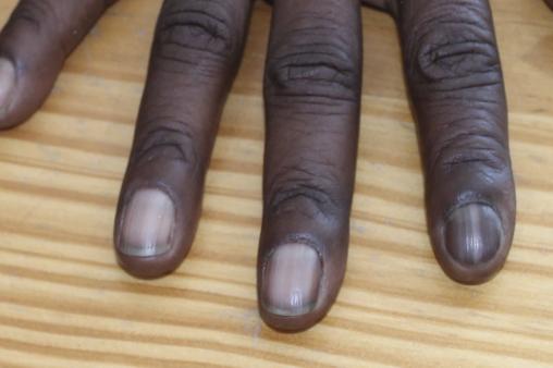 Lors de l’examen d’Efia, 35 ans, d’origine ghanéenne, nous remarquons qu’elle a un ongle très pigmenté. Elle nous explique avoir cette anomalie depuis son jeune âge.