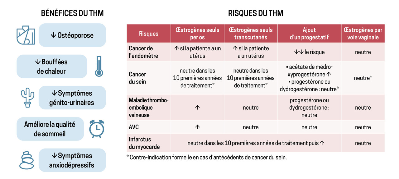 La fig. 2 recense les bénéfices et risques attribués au THM sur la base des données les plus récentes.5 Les bénéfices sur la qualité de vie et la santé osseuse sont largement démontrés et connus, mais ne sont pas détaillés ici.