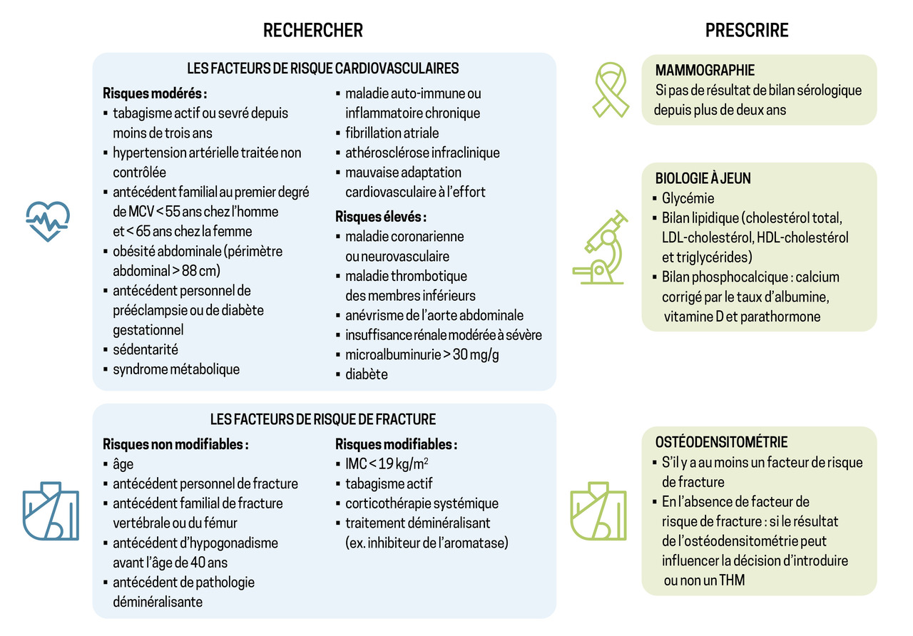 Assurer un suivi régulier des patientes ménopausées permet de prévenir et détecter précocement toute situation pouvant mener à une morbi-mortalité induite ou favorisée par le manque d’œstrogènes et l’âge. La fig. 1 reprend la liste des points indispensables à évaluer lors de la première consultation d’une patiente ménopausée. Ce bilan, essentiel et à répéter, doit précéder toute décision de prescrire un traitement hormonal de la ménopause (THM), dont l’indication repose exclusivement sur la balance bénéfices-risques propre à chaque patiente. Bien entendu, cette décision de traiter doit toujours être prise en concertation avec une patiente dûment éclairée.3