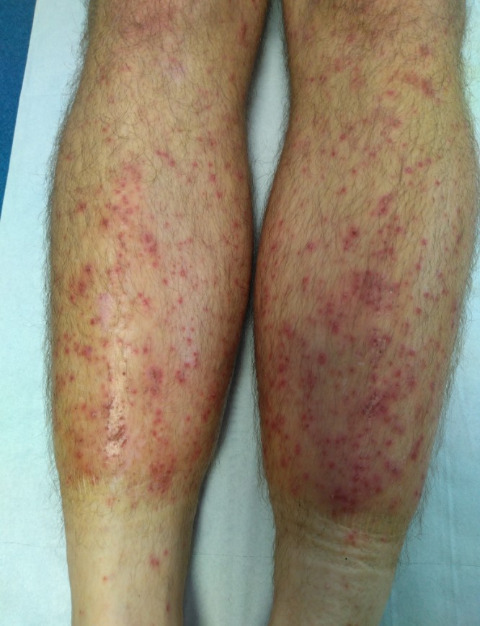 Les lésions sont érythémateuses, papuleuses, prurigineuses avec un début de surinfection (fig. 1 et 2).