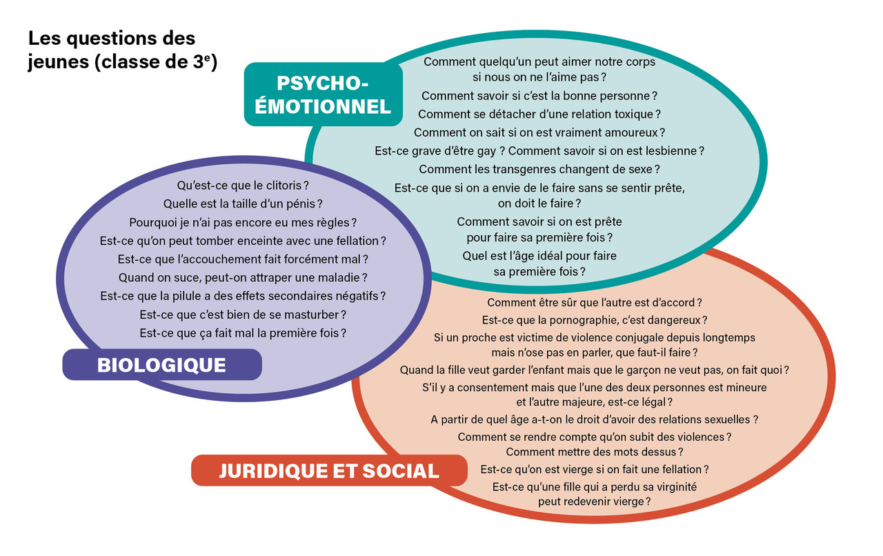 La figure expose des exemples de questions soulevées par les jeunes en classe de troisième dans les différents champs d’intervention d’éducation à la sexualité glanées par les CCF yvelinois.