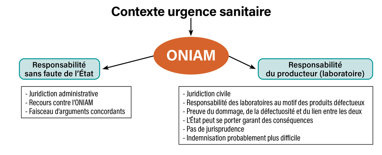 Selon l’Oniam, même si l’indemnisation totale est possible par l’État, le laboratoire conserve sa responsabilité du fait des produits défectueux. Les clauses dans les contrats écartant les laboratoires de toutes responsabilités sont illégales. Des actions contre les fabricants pourraient donc être entreprises mais ne sont pas retrouvées dans la jurisprudence. On peut penser que ces cas seraient jugés comme pour les vaccinations recommandées de l’hépatite B et nécessiteraient des présomptions graves, précises et concordantes pour déterminer une causalité juridique. Dans ce cadre, la victime doit, en théorie, apporter la preuve du dommage, de la défectuosité du produit et du lien de causalité entre les deux.