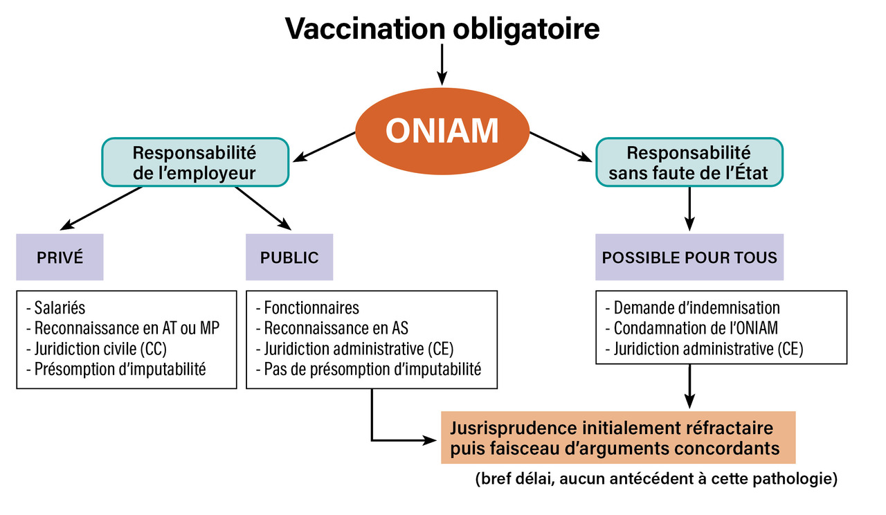 Pour toute demande concernant une vaccination obligatoire, on peut rechercher la responsabilité sans faute de l’État, peu importe s’il s’agit d’une structure professionnelle publique ou privée ou d’une vaccination obligatoire générale, le patient a droit à une réparation intégrale par l’Oniam dont la mission est d’assurer par un accord amiable la réparation intégrale des préjudices imputables à une vaccination obligatoire.