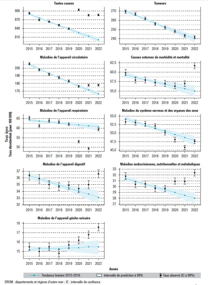 Cadillac M, Fouillet A, Rivera C, et al. Les causes de décès en France en 2022 : recul du Covid-19 et hausse des maladies respiratoires. Drees 2024;1312.