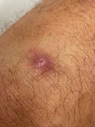 L’examen met en évidence une éruption cutanée érythémateuse papulo-nodulaire avec un orifice circulaire central (figure) laissant passer par intermittence un exsudat jaune verdâtre, sans autre symptôme.