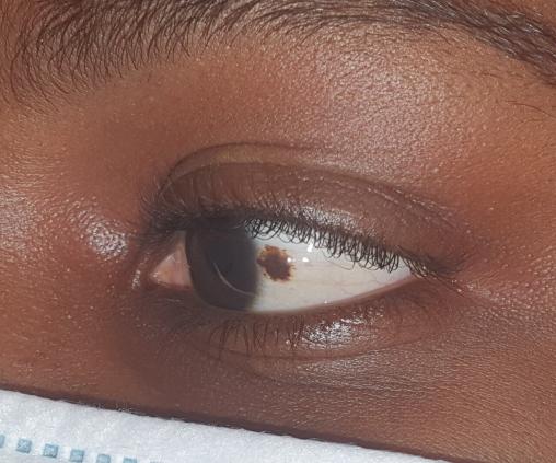 Cliniquement, il s’agit d’une formation de couleur brune, ou parfois noire, au niveau de la conjonctive. Chez les jeunes enfants, ces tumeurs peuvent être peu pigmentées. Le nævus est bien limité et, dans 33 % des cas, il est possible d’observer des vaisseaux nourriciers à sa périphérie. Après l’adolescence, les nævi conservent la même morphologie dans près de 92 % des cas.