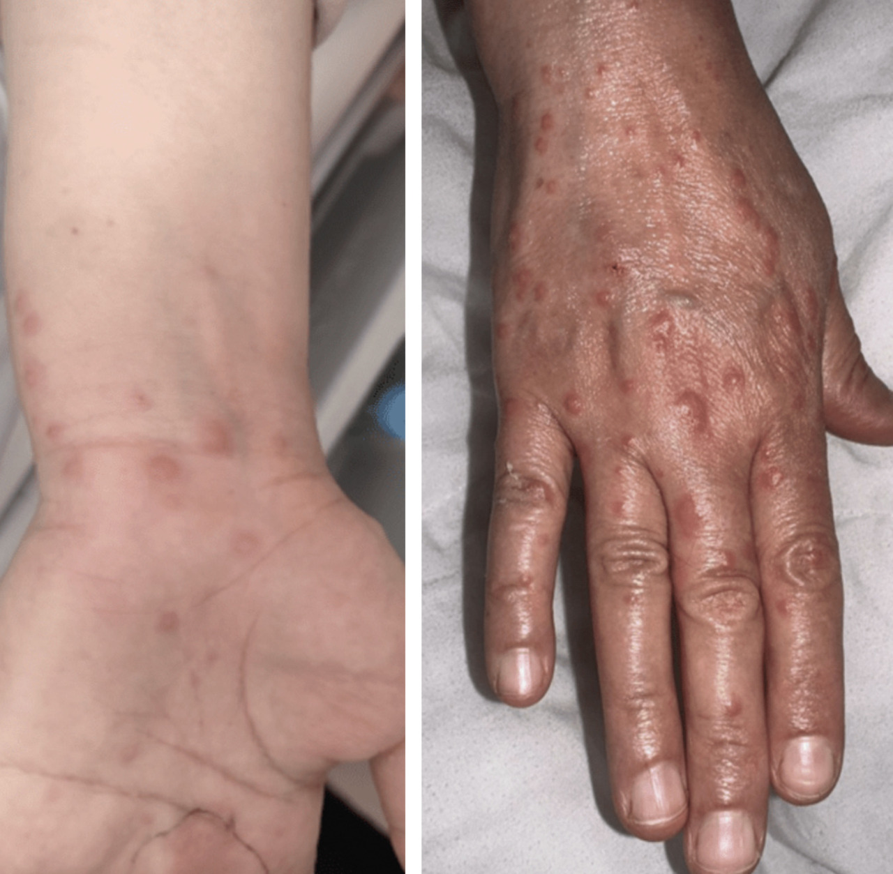Le lendemain, la patiente développe un érythème prurigineux sur les deux mains, avec de multiples lésions érythémateuses maculopapuleuses de taille millimétrique, formant un aspect en rosette par endroits, sans atteinte des muqueuses et sans altération de l’état général (fig. 2). La patiente n’a pas signalé d’infection par le virus de l’herpès ou de symptômes pulmonaires récents.