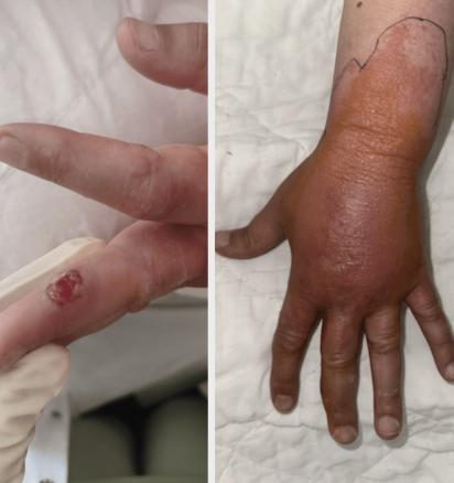 Une patiente âgée de 40 ans, sans antécédents médicaux significatifs, consulte aux urgences pour une plaque large, érythémateuse, œdémateuse, chaude et douloureuse sur le dos de la main, survenue quelques jours après l’apparition d’un nodule croûteux sur la face interne du 3e doigt de la même main, que la patiente a manipulé et négligé (fig. 1). Lors de l’interrogatoire, elle signale que la lésion est apparue quelques jours après l’Aïd al-Adha, fête durant laquelle elle a aidé son mari, vendeur de moutons, à nourrir et transporter les animaux. La patiente a remarqué des lésions similaires chez son mari.